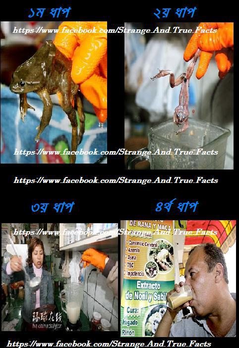 পেরুতে গত ১৫ বছর ধরে ব্যাঙের জুস বিক্রি করা হচ্ছে।। সেখানকার কিছু স্থানীয়রা প্রতিদিন এই জুস পান করে থাকেন!! কারন, তাদের ধারণা, এ থেকে তারা শক্তি পায়!!